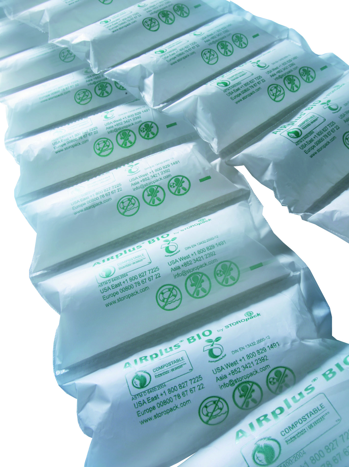Luftpolster aus der AIRplus® Bio Home Compostable Folie von Storopack zeigen, dass es umweltbewusste Verpackungen gibt, die die Definition von Biokunststoff erfüllen: Sie sind zu Teilen biobasiert und kompostierbar in einem. Die Folie besteht teilweise aus dem nachwachsenden Rohstoff Stärke, was sie zu einer besonders umweltfreundlichen Verpackungslösung macht. Luftpolster aus dieser Bio-Folie zeichnen sich durch hervorragende Verpackungseigenschaften aus und sind ideal, um leichtes bis mittelschweres Versandgut zuverlässig zu schützen. Die Folie ist nach dem TÜV Austria zertifiziert heim- und gartenkompostierbar. Endverbraucher können die Luftpolster zusammen mit organischen Abfällen ganz einfach auf dem heimischen Kompost entsorgen. Die Mikrokultur des Komposts wandelt die Bio-Folie vollständig in Kohlendioxid, Wasser und Biomasse um. Dadurch wird Plastikmüll reduziert und die Schließung des natürlichen Kreislaufs unterstützt.