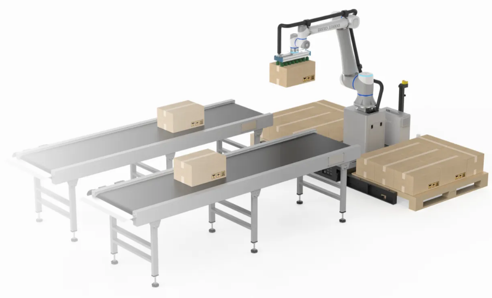 Unsere All-in-One Palettieranlage ist mit leistungsstarken kollaborativen Robotern ausgestattet, die eine maximale Traglast von 30 kg und eine maximale Palettierhöhe von bis zu 2.300 mm bieten. Damit werden die Palettieranforderungen in verschiedenen Branchen wie 3C-Elektronik, Gesundheitswesen, Lebensmittel und Getränke Verpackungsindustrie mühelos erfüllt. Die Palettiergeschwindigkeit kann 12 Stück pro Minute erreichen