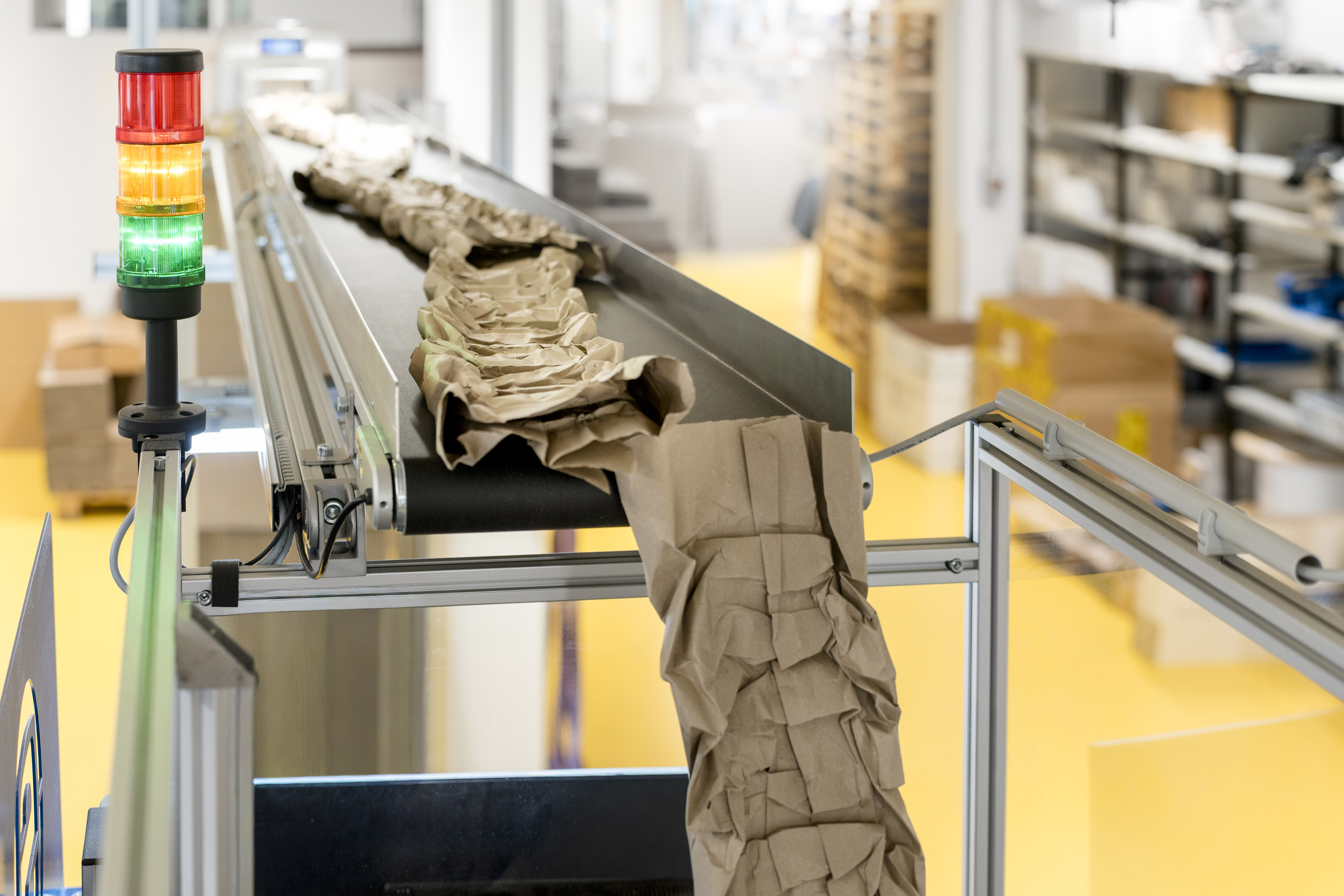 Der Materialfluss – inklusive des Polstertransports per Förderband – ist optimal auf den verfügbaren Raum sowie die Packprozesslogistik abgestimmt.